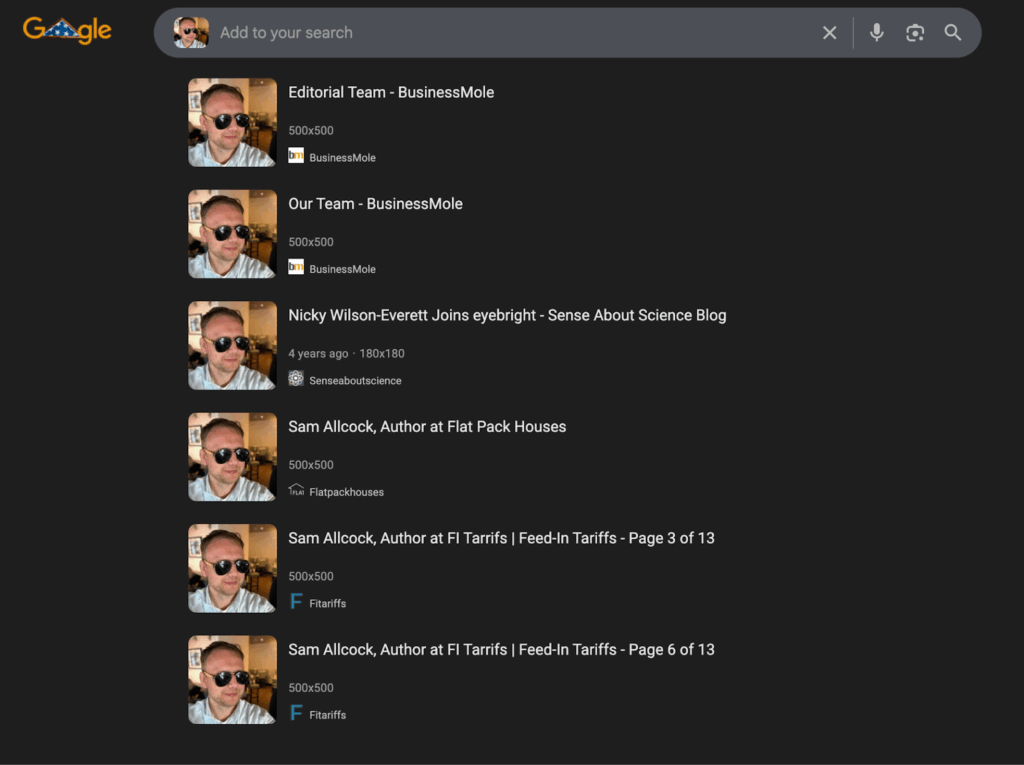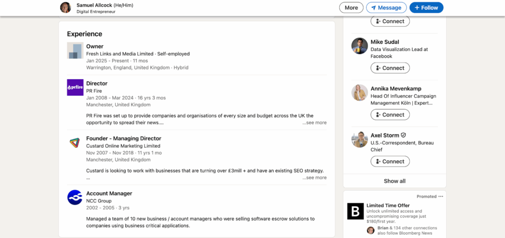 A PimEyes facial recognition search of the “Newsteam PR” profile photo suggests that this is indeed the same Sam Allcock as seen on BusinessMole.