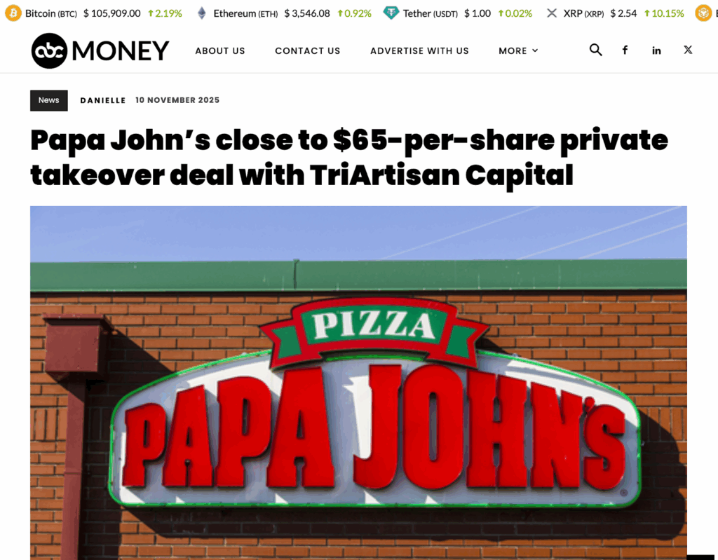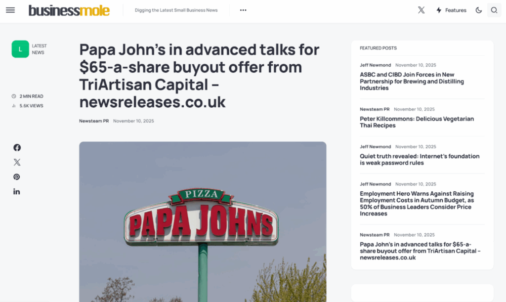 BusinessMole appears to be the first outlet that published the Papa Johns takeover news. Other sites and blogs followed.