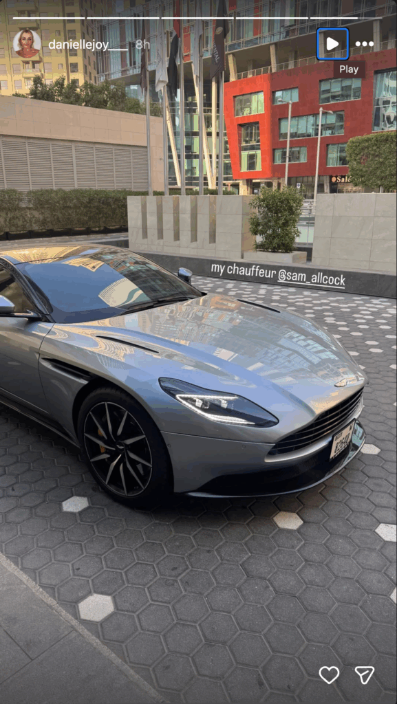 And they follow each other on Instagram. A recent Instagram Story on Trigg’s account suggests that she is currently in Dubai with Allcock, who lives there. The post appears to show Allcock’s Aston Martin. Allcock appears to operate out of Dubai’s Media City, an Emirate-established free trade zone launched in 2001 to attract global and regional media companies by offering 100% foreign ownership, tax exemptions, and advanced infrastructure.
