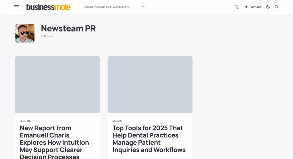 The BusinessMole article was posted on its website at 8:26 a.m. Eastern time — about an hour before markets opened in the U.S. — under the profile “Newsteam PR.” A reverse image search of the profile photo leads to Sam Allcock, an author across several news sites and blogs.