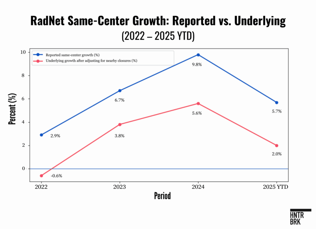 - The success of RadNet’s roll up business is also misunderstood. By reconstructing RadNet’s footprint and tracking closures, a financial analysis estimates that about half of reported “same-center” revenue growth in recent years came from closing centers located within 15 minutes of surviving RadNet sites and apparently shifting the patients over. Get rid of this consolidation, and organic growth drops to an estimated 2.5%–3%, rather than the reported 6%–10%.