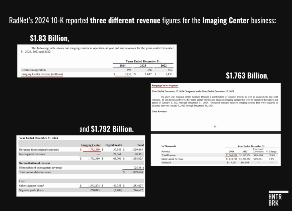 In its 2024 10-K, RadNet reported three different revenue figures — $1.83 billion, $1.763 billion, and $1.792 billion — for its old Imaging Center business, the core business that dwarfs Digital Health.
