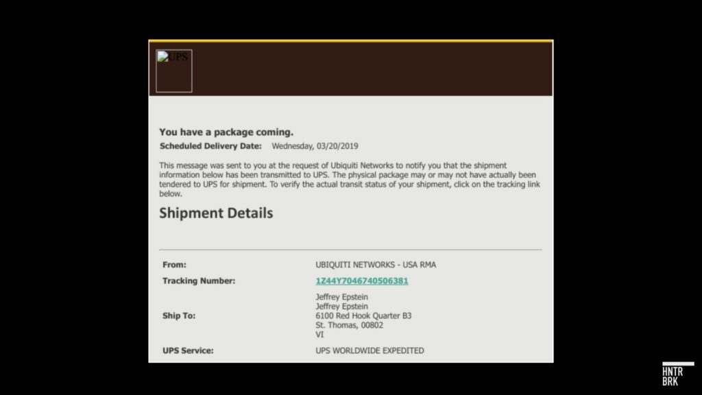 Hunterbrook found no evidence Ubiquiti knew about the end use of its equipment on Epstein’s island. The company’s products are widely used in commercial and residential deployments. Other than the UPS confirmation on a delivery from Ubiquiti, there is no indication the company had knowledge of its recording devices being used by a sex offender. (Which, you know, was probably kind of the point!)